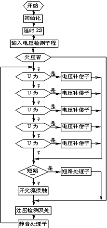 系統(tǒng)接通市電,合上電源開關(guān)后,單片機(jī)進(jìn)行初始化,延時(shí)2秒后,進(jìn)行輸入電壓檢測(cè),若輸入電壓在允許范圍內(nèi),則根據(jù)電壓值進(jìn)行相應(yīng)的電壓補(bǔ)償,否則補(bǔ)償電路不進(jìn)行任何動(dòng)作,但要相應(yīng)的聲光告警;電壓調(diào)整完畢達(dá)到輸出標(biāo)準(zhǔn)后,自動(dòng)合上輸出交流接觸器,系統(tǒng)正常輸出。此時(shí),單片機(jī)對(duì)輸出電壓進(jìn)行過(guò)壓檢測(cè),一旦輸出電壓過(guò)高,則切斷輸出,以防輸出電壓過(guò)高而影響負(fù)載工作,在電壓恢復(fù)正常后,自動(dòng)合閘,輸出電壓。單片機(jī)還對(duì)輸入電壓進(jìn)行實(shí)時(shí)檢測(cè),只要市電發(fā)生變化,就進(jìn)入相應(yīng)的電壓補(bǔ)償子程序,對(duì)補(bǔ)償電壓進(jìn)行調(diào)整。其流程圖見圖5。