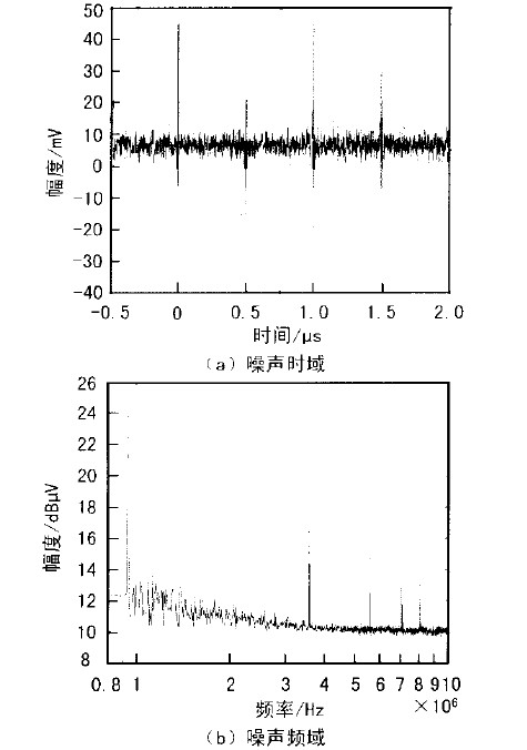 選取一只10nF電容并聯(lián)在PCB直流供電電源2端。測試結(jié)果如圖4所示。圖4(a)為噪聲頻域圖,頻率1MHz的噪聲輻度由24dB減少至18dB。圖4(b)為噪聲時域圖,均方根振幅由圖2(b)的11.03mV降到濾波后的4.98mV。