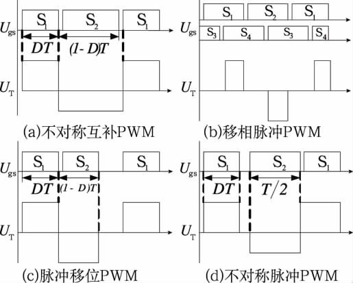 控制型軟開關(guān)半橋DC/DC變換器不增加主電路元器件(可增加電感電容元件以實(shí)現(xiàn)軟開關(guān)條件),通過合理設(shè)計(jì)控制電路來實(shí)現(xiàn)軟開關(guān)。圖1給出4種控制型軟開關(guān)半橋DC/DC變換器的PWM 控制策略。