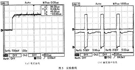 實(shí)驗(yàn)曲線如圖5所示,實(shí)驗(yàn)數(shù)據(jù)為輸入電壓12 V,輸出電壓2 V左右,測(cè)量電阻0.0025 Ω,最大輸出電流20 A。