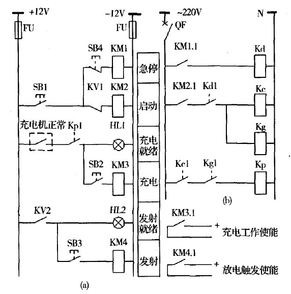 圖3(a)中,KM1-4為SSR,SB1-4為自鎖按鈕。系統(tǒng)上電后,通過按鈕SB1啟動KM1和KM2,這樣Kd將首先得電動作,隨后Kc、Kg、Kp也相繼動作,為下一步進行的充電工作做好了準備。圖3(b)中,Kc和Kg啟動采用了位置接點Kdl,同樣Kp啟動也采用了位置接點Kcl和Kgl,這樣設計目的是使控制電路具有了邏輯動作與防誤閉鎖功能。此時只要充電設備自檢正常(圖3(a)中"充電機正常"接點閉合),則燈HI 1指示可以進行充電,通過按鈕SB2啟動KM3便可對脈沖電容器組進行充電。脈沖電容器電壓達到預設值后,KV動作,常閉接點KV1斷開致使KM2失電,則Kc、Kg、Kp相繼返回,同時Kp返回又使KM3失電,這樣Kc、Kg斷開,充電機停止工作,滿足了系統(tǒng)放電前提。此時燈HL1熄滅、KV2接通,燈HL2指示充電完畢,通過按鈕SB3啟動KM4則可進行ETCG發(fā)射。