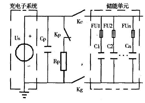通常,充電子系統(tǒng)內部配有過電流、過電壓和過熱等故障保護或異常告警裝置。但這些裝置的保護范圍一般僅限于充電子系統(tǒng)內部,PPS放電時浪涌電壓等外部因素仍可能造成充電設備損壞。因此,在儲能單元和充電子系統(tǒng)間還需配置一些隔離和保護電路。圖1給出了用于ETCG研究的PPS所配置的充電隔離及保護電路。圖1中,充電隔離開關(Kc)和地絕緣隔離開關(Kg)在充電結束后打開,用以防止PPS放電時由負載等因素產生的浪涌高電壓通過充電子系統(tǒng)對地放電,可以避免因此所造成的充電設備絕緣損壞;充電輸出終端并聯(lián)了一小容量電容器(Cp)及其安全釋能電路(開關Kp、電阻Rp),目的在于防止空載誤充電,以避免在此情況下充電電路末端電壓急劇升高損壞充電設備。