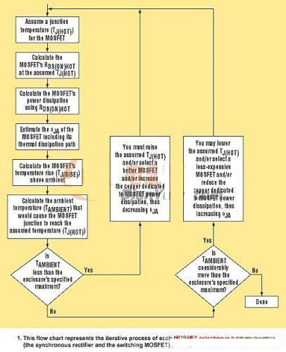 這一過程從首先假設(shè)各MOSFET的結(jié)溫開始,同樣的過程對于每個(gè)MOSFET單獨(dú)進(jìn)行。MOSFET的功率耗散和允許的環(huán)境溫度都要計(jì)算。