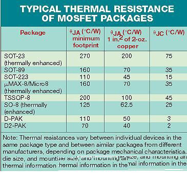 例如,采用1平方英寸的銅片,D-Pak的ΘJAD-Pak可能是50°C/W。但如果銅片就設(shè)在封裝引腳下,ΘJA值將會(huì)加倍(參見表)。采用多個(gè)并聯(lián)MOSFET,ΘJA主要依賴于它所安裝的銅片面積。兩個(gè)元器件的等效ΘJA可能是只有一個(gè)元器件時(shí)的一半,除非銅片的面積加倍。就是說,增加并聯(lián)MOSFET而不同時(shí)增加銅片面積,將使RDS(ON)減半,但對ΘJA的改變小得多。