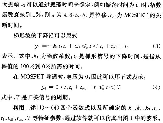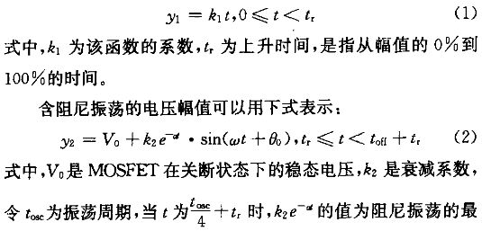 圖1中展示了一MOSFET的漏源極電壓波形,為了研究其上升時(shí)間、下降時(shí)間、阻尼振蕩等對(duì)其頻譜的影響,需要確定該波形的特征參數(shù),然后運(yùn)用Matlab編程仿真。由于該波形是由一個(gè)梯形信號(hào)和一個(gè)阻尼振蕩信號(hào)疊加而成,因此可以用分段函數(shù)進(jìn)行模擬。上升沿可以用式(1)表示。