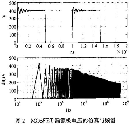 圖1所示是某型號(hào)開關(guān)電源中MOSFET漏源極的電壓波形,由一個(gè)梯形信號(hào)和一個(gè)阻尼振蕩信號(hào)疊加而成,梯形信號(hào)的上升時(shí)間和下降時(shí)間一般在十納秒到一百納秒之間,電壓和電流的變化率很快,而阻尼振蕩信號(hào)則成正弦波的指數(shù)衰減形式,它的振蕩周期一般為幾十到幾百納秒。由于梯形信號(hào)上升沿下降沿的di/dt, dv/dt很大,將產(chǎn)生很強(qiáng)的干擾電壓和電流,這些電壓和電流通過某種耦合方式傳輸?shù)捷斎牒洼敵龆丝诰蜁?huì)形成電磁干擾。在開關(guān)電源中,干擾源處的電磁干擾通常具有頻譜范圍廣,干擾強(qiáng)度大的特點(diǎn)。
