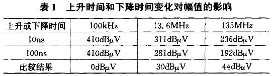 開關(guān)信號(hào)的上升和下降沿對(duì)干擾的幅值影響很大,圖3是上升時(shí)間或下降時(shí)間為10ns時(shí)的上升沿或下降沿的頻譜,把上升時(shí)間或下降時(shí)間改為100ns再仿真時(shí)發(fā)現(xiàn):當(dāng)上升時(shí)間或下降時(shí)間增加時(shí),隨著頻率的升高,幅值減小的越快,也就是說,上升或下降時(shí)間的變化對(duì)高頻干擾幅值影響更大。表1中列出了上升時(shí)間或下降時(shí)間為10ns和100ns時(shí),不同頻率的電磁干擾幅值和比較結(jié)果。從圖中還可以看出在頻率為