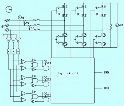 虛擬整流技術的實現(xiàn),主要通過三相同步檢測電路取得同步控制信號,然后控制功率器件來模擬二極管橋式整流電路對三相交流電進行整流,同時防止輸入的三相交流電相間短路。其原理如圖9所示,是一個輸出方向固定的虛擬整流電路。仿真波形如圖5所示,它們分別是矩陣變換單元的三相輸入電壓、6路同步信號和虛擬整流后得到的輸出電壓波形。