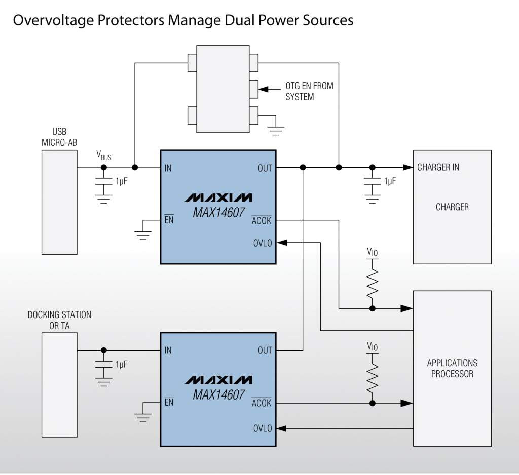 Maxim的過(guò)壓保護(hù)器采用反向偏置電路保護(hù)多電源供電便攜設(shè)備