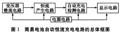 簡(jiǎn)易電池自動(dòng)恒流充電電路的總體框圖如圖1所示。它是由變壓器整流電路、恒流產(chǎn)生電路、自動(dòng)斷電電路、顯示電路和電源電路5部分構(gòu)成。