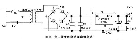 變壓器整流電路和穩(wěn)壓電源電路(如圖2虛線左邊所示),其主要由變壓器、二極管橋式電路、電容構(gòu)成。其中變壓器采用常規(guī)的鐵心變壓器,并將公共電網(wǎng)中的220 V交流電變?yōu)?2 V交流電,再通過二極管橋式電路進(jìn)行整流和電容C1濾波。整流信號(hào)由VC1引出。在此基礎(chǔ)上再接三端穩(wěn)壓器CW7812及電容C3、C4(如圖2虛線右邊所示),這樣整個(gè)電路就構(gòu)成穩(wěn)壓電源電路。由B點(diǎn)提供+12 V的直流電壓。