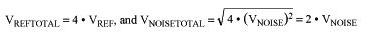 多個基準(zhǔn)源串聯(lián)可以降低LF噪聲。使用多個電壓源(每個電壓源等效于一個直流源和一個噪聲源)時,直流電壓線性增加,噪聲源(如果非相關(guān))則是以RMS幾何求和。例如,使用四個基準(zhǔn)源,每個基準(zhǔn)源等效于一個VREF基準(zhǔn)和一個VNOISE噪聲,則產(chǎn)生如下輸出: