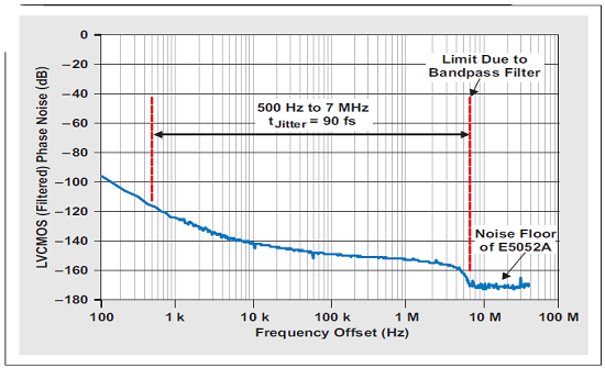圖 12 所示曲線圖描述了濾波后 CDCE72010 LVCMOS 輸出的測(cè)得輸出相位噪聲。131000 點(diǎn)的 FFT 大小將低積分帶寬設(shè)定為 ~500 Hz。積分上限由帶通濾波器設(shè)定,其影響在相位噪聲曲線圖中清晰可見。超出曲線圖所示帶通濾波器限制的相位噪聲為 E5052A 的噪聲底限,不應(yīng)包括在抖動(dòng)計(jì)算中。濾波后相位噪聲輸出的積分帶來 ~90 fs 的時(shí)鐘抖動(dòng)。