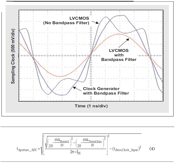 不匹配的原因是,計(jì)算得出的孔徑抖動(dòng)是基于時(shí)鐘源生成器的快速轉(zhuǎn)換速率。CDCE72010 的 LVCMOS 輸出消除了時(shí)鐘信號(hào)的高階諧波,其有助于形成快速升降沿。圖 13 所示波形圖表明了帶通濾波器急劇降低未濾波 LVCMOS 輸出轉(zhuǎn)換速率,以及將方波轉(zhuǎn)換為正弦波的過程。