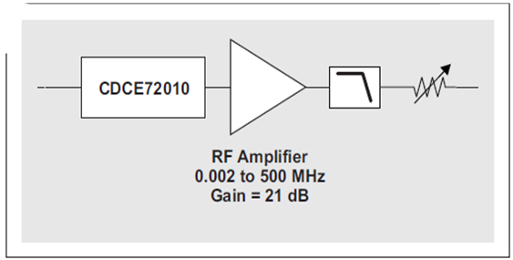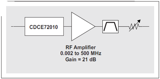 改善轉(zhuǎn)換速率的一種方法是:在 CDCE72010 的 LVCMOS 輸出和帶通濾波器之間添加一個(gè)具有相當(dāng)量增益的低噪聲 RF 放大器,參見圖 14。該放大器應(yīng)該放置于濾波器前面,這樣便可以將其對(duì)時(shí)鐘信號(hào)的噪聲影響程度限定在濾波器帶寬,而非 ADC 的時(shí)鐘輸入帶寬。由于下一個(gè)試驗(yàn)的放大器具有 21 dB 的增益,因此我們?cè)趲V波器后面增加了一個(gè)可變衰減器,旨在匹配濾波后 LVCMOS 信號(hào)到時(shí)鐘生成器濾波后輸出的轉(zhuǎn)換速率。該衰減器可防止 ADC 的時(shí)鐘輸入超出最大額定值。
