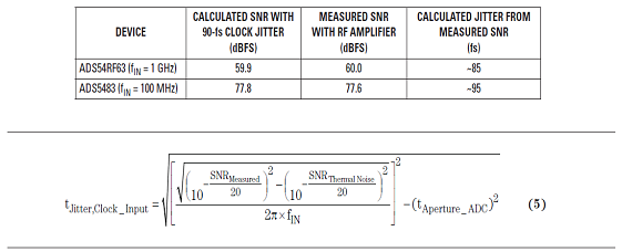 通過在時(shí)鐘輸入通路中安裝低噪聲 RF 放大器,兩個(gè)數(shù)據(jù)轉(zhuǎn)換器重復(fù)進(jìn)行了高輸入頻率的 SNR 測(cè)量,其結(jié)果如表 5 所示。我們可以看到,測(cè)得 SNR 和預(yù)計(jì) SNR 匹配的非常好。使用下面的方程式 5,計(jì)算得到的時(shí)鐘抖動(dòng)值在 90-fs 時(shí)鐘抖動(dòng)的 5 fs 以內(nèi),其結(jié)果通過相位噪聲測(cè)得推導(dǎo)得出。