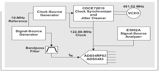 我們做了一個(gè)試驗(yàn),目的是檢查測(cè)得時(shí)鐘相位噪聲與提取自 ADC 測(cè)得 SNR 的時(shí)鐘抖動(dòng)的匹配程度。如圖 11 所示,一個(gè)使用 Toyocom 491.52-MHz VCXO 的 TI CDCE72010 用于產(chǎn)生 122.88-MHz 采樣時(shí)鐘,同時(shí)我們利用 Agilent 的 E5052A 來對(duì)濾波相位噪聲輸出進(jìn)行測(cè)量。利用一個(gè) SNR 主要受限于采樣時(shí)鐘抖動(dòng)的輸入頻率對(duì)兩種不同的 TI 數(shù)據(jù)轉(zhuǎn)換器(ADS54RF63 和 ADS5483)進(jìn)行評(píng)估。快速傅里葉變換 (FFT) 的大小為 131000 點(diǎn)。