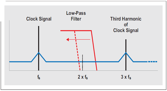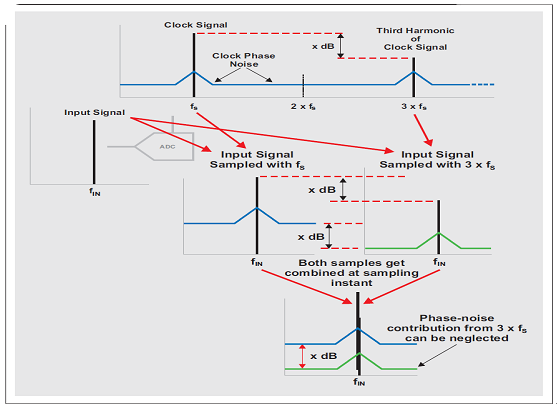 在采樣時(shí)間,基頻正弦波及高階諧波與輸入信號(hào)混頻,如圖 16 所示。(為了簡單起見,僅顯示了一個(gè)諧波。)因此,三階諧波周圍的相位噪聲與輸入信號(hào)混頻,而第三諧波也形成一個(gè)混頻結(jié)果。但是,由于時(shí)鐘信號(hào)的第三諧波的振幅更低,因此該混頻結(jié)果的振幅也被降低。