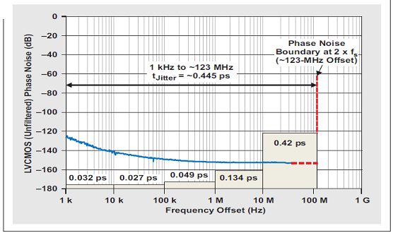 將不同轉(zhuǎn)角頻率的低通濾波器用于 ADS54RF63 的采樣時(shí)鐘(如圖 18 所示),得到了一些如表 7 所列有趣值。該試驗(yàn)結(jié)果表明,LVCMOS 輸出對(duì)時(shí)鐘抖動(dòng)的相位噪聲影響被限制在約 200 到 250 MHz,其相當(dāng)于 122.88-MHz 時(shí)鐘信號(hào)的 80-MHz 到 130-MHz 偏移頻率,并約為 2x 采樣頻率。因此,將寬帶相位噪聲擴(kuò)至 123-MHz 偏移頻率,會(huì)產(chǎn)生 ~445 fs 的時(shí)鐘抖動(dòng),如圖 19 所示。理想情況下,積分下限應(yīng)該位于 500 Hz 處(原因是選擇的 131000點(diǎn)FFT);但是,500-Hz 到 1 kMz 偏移頻率的抖動(dòng)貢獻(xiàn)值極其低,因此為了簡單起見其在本測(cè)量中被忽略。