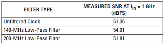 為了證明未濾波時(shí)鐘信號(hào)的相位噪聲需要積分至約兩倍采樣頻率,我們實(shí)施了如下試驗(yàn):在 CDCE72010 輸出和 ADS54RF63 時(shí)鐘輸入之間添加不同的低通濾波器。