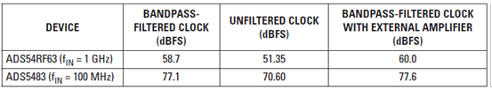 本文介紹了使用某個(gè)濾波或未濾波時(shí)鐘源時(shí),如何正確地估算數(shù)據(jù)轉(zhuǎn)換器的 SNR。表 9 概括了得到的結(jié)果。盡管時(shí)鐘輸入的帶通濾波器對(duì)于最小化時(shí)鐘抖動(dòng)是必要的,但實(shí)驗(yàn)表明它會(huì)降低時(shí)鐘轉(zhuǎn)換速率,并使 ADC 的孔徑抖動(dòng)降級(jí)。因此,最佳的時(shí)鐘解決方案應(yīng)包括一個(gè)限制相噪影響的帶通濾波器,以及一定的時(shí)鐘振幅放大和轉(zhuǎn)換速率,目的是最小化 ADC 的孔徑抖動(dòng)。