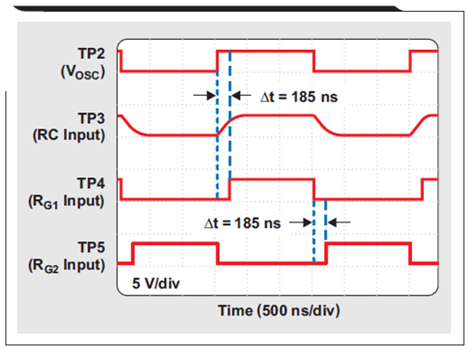 著名的三反相門振蕩器由 U1a、U2a 和 U2b 組成,選擇它是因?yàn)樗诠╇姴▌?dòng)方面較為穩(wěn)定。通過一個(gè) 100-pF 陶瓷電容器(COSC)和兩個(gè) 10-kΩ 電阻器(ROSC1 和 ROSC2),它的正常頻率被設(shè)定為 330kHz。在 3.0-V 到 3.6-V 電源電壓波動(dòng)范圍內(nèi),振蕩器擁有接近 50% 的占空比,以及低于 ±1.5% 的最大頻率波動(dòng)。圖 2 顯示了 ROSC1 和 ROSC2 (TP1) 相加點(diǎn)和振蕩器輸出 (TP2) 處的波形。所有電壓均為參考電路基準(zhǔn)電壓測(cè)得。[page]