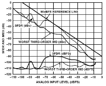 二階和三階交調(diào)截點的概念對ADC無效,因為,在這種情況下,失真積的變化不可預(yù)測(作為信號幅度的函數(shù))。ADC并不是逐漸開始壓縮接近滿量程的信號(不存在1 dB壓縮點);一旦信號超過ADC輸入范圍,ADC就會充當硬限幅器,從而因削波而突然產(chǎn)生數(shù)量極大的失真。另一方面,對于遠遠低于滿量程的信號,失真底保持相對穩(wěn)定,不受信號電平影響,如圖3所示。