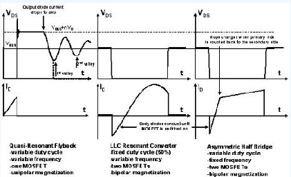 圖1所示為采用三種不同拓?fù)?準(zhǔn)諧振反激式拓?fù)?、LLC諧振拓?fù)浜褪褂密涢_(kāi)關(guān)技術(shù)的非對(duì)稱半橋拓?fù)?的開(kāi)關(guān)的電壓和電流波形。