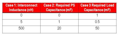 表1對(duì)舉例系統(tǒng)三個(gè)互連電感的要求電容器進(jìn)行了比較。通過(guò)改變互連電感、計(jì)算負(fù)載旁路電容并設(shè)計(jì)電源的相應(yīng)輸出級(jí)和控制環(huán)路,得到比較數(shù)據(jù)。案例1的負(fù)載和電源并列放置;案例2電源和負(fù)載之間的互連電感大小為中等。案例3中,使用線纜連接的電源的電感極高。要求旁路的多少直接與互連電感有關(guān)。