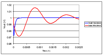 圖 2 對(duì)小和大互連電感的負(fù)載瞬態(tài)期間的輸出電壓變化模擬情況進(jìn)行了比較。小電感響應(yīng)快速漸次減弱,而大電感則并非如此,花費(fèi)了較長(zhǎng)的時(shí)間才穩(wěn)定下來(lái)。這是由于特性阻抗更高以及諧振頻率更低。另外,如果負(fù)載電流在該諧振頻率有規(guī)律地跳動(dòng),則會(huì)出現(xiàn)極寬且具破壞性的電壓變化。