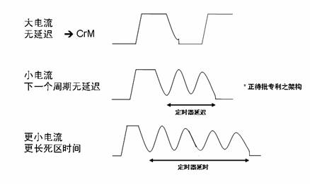 具體講,CCFF架構(gòu)具有固定導(dǎo)通時(shí)間控制和頻率反走特性。在大電流時(shí),電路以臨界導(dǎo)電模式工作。小電流時(shí)(重負(fù)載時(shí)接近線(xiàn)路過(guò)零點(diǎn),輕載時(shí)位于全部正弦方波),因此,磁芯復(fù)位后下一個(gè)周期并不會(huì)立即啟動(dòng);相反,定時(shí)器開(kāi)始調(diào)節(jié)死區(qū)時(shí)間;電流越小,定時(shí)器持續(xù)時(shí)間(死區(qū)時(shí)間)越長(zhǎng);定時(shí)器持續(xù)時(shí)間取決于大??;定時(shí)器僅控制死區(qū)時(shí)間(不控制開(kāi)關(guān)周期/關(guān)閉時(shí)間)。由于死區(qū)時(shí)間不受電流周期時(shí)長(zhǎng)變化的影響,因此可以毫不猶豫地進(jìn)行谷底導(dǎo)通。