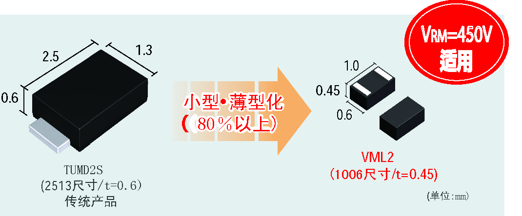 這次,羅姆通過改善結構設計和裝配工藝使封裝得到優(yōu)化,成功開發(fā)出了世界最小的“VML2”封裝(1006尺寸∶1.0mm×0.6mm)快速恢復二極管。與傳統(tǒng)的2513尺寸(2.5mm×1.3mm)相比,體積減少約86%。不僅體積小巧,高達450V耐壓特性也是其特長之一。