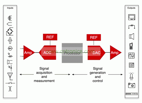 圖 1 所示結(jié)構(gòu)圖可代表信號(hào)處理的所有系統(tǒng)。如果它是一個(gè)測量或者數(shù)據(jù)采集系統(tǒng),則信號(hào)鏈開始于傳感器,經(jīng)過信號(hào)調(diào)節(jié)電路,進(jìn)入一個(gè) ADCr,然后結(jié)束于處理器。如果它是一個(gè)控制系統(tǒng)、一個(gè)音頻處理系統(tǒng)亦或是一個(gè)軟件定義無線電設(shè)備則可能存在一些必須變回到模擬信號(hào)的處理器輸出;這種情況顯示在結(jié)構(gòu)圖的右手側(cè)二分之一處。