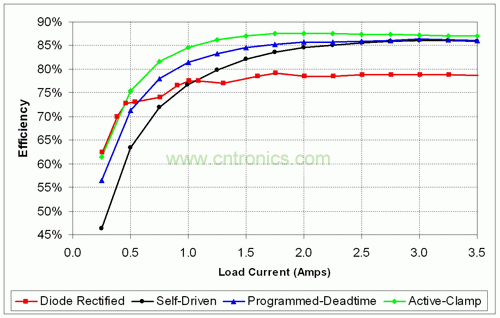 圖 6 顯示了每次二極管整流反向結(jié)構(gòu)升級對實際設(shè)計效率的提升程度。電源將一個遠距通信 48VDC 輸入轉(zhuǎn)換為一個 3.5A 最大負載電流的 3.3V 輸出。將一個二極管整流器轉(zhuǎn)換為一個自驅(qū)動同步反向結(jié)構(gòu)使最大負載效率提高超過 7%,但也確實降低了 1A 以下輸出電流的輕負載效率。這是由于同步 MOSFET 帶來了柵極驅(qū)動損耗、開關(guān)損耗和直通損耗。如圖 7 所示,輕負載狀態(tài)下這些損耗在總損耗中占較大百分比,從而降低了輕負載的效率。使用可編程延遲消除了直通損耗,從而極大地提高了輕負載的效率,如圖 7 所示。由于其他電路損耗在同步 MOSFET 損耗中占主導(dǎo)地位,因此滿負載效率保持基本不變。最終,有源鉗位的實施提高了所有負載條件下 3.3V 電源的效率。