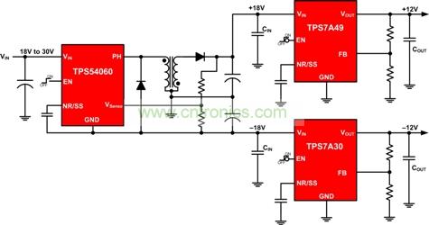 要創(chuàng)建這種參考設(shè)計,需使用一個降-升壓結(jié)構(gòu)的 +60V 開關(guān)轉(zhuǎn)換器來產(chǎn)生一個平衡的+/-輸出電壓。利用低噪聲、高 PSRR LDO(例如:TPS7A30 和 TPS7A49 等),對開關(guān)的正負(fù)電壓輸出進(jìn)行后期穩(wěn)壓。圖 2 中,–18V 軌的開關(guān)穩(wěn)壓器電壓紋波為約 40mV,而 +18V 軌則為 20mV。通過使用 LDO 對 300 kHz 開關(guān)穩(wěn)壓器的輸出進(jìn)行后期穩(wěn)壓,電壓紋波得到極大減弱。這里,我們使用 60V 開關(guān)轉(zhuǎn)換器,因為接地引腳參考至 –18V 軌,并且最大 VIN為 30V。在這種配置中,開關(guān)轉(zhuǎn)換器必須承受的最大電壓為 48V。請為其寬輸入電壓、低輸出噪聲和高 PSRR 選擇 LDO。