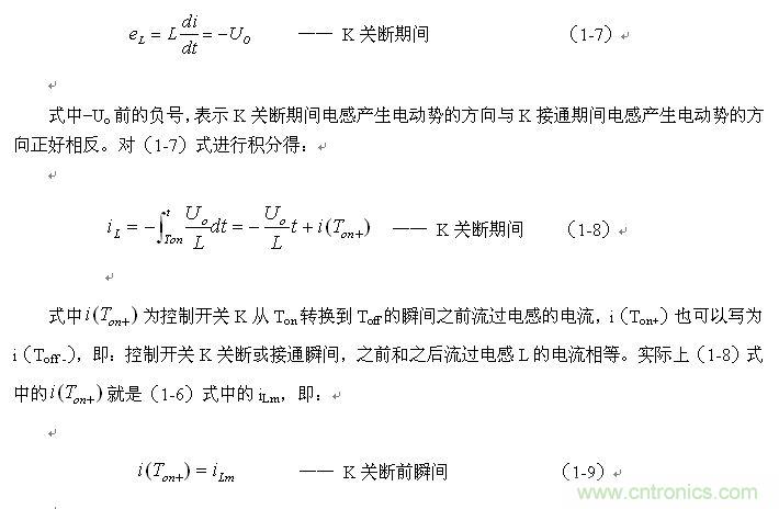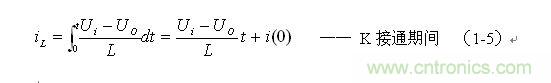 在此順便說明:由于電容兩端的電壓變化量ΔU相對(duì)于輸出電壓Uo來說非常小,為了簡(jiǎn)單,我們這里把Uo當(dāng)成常量來處理。在某種情況下,當(dāng)我們需要對(duì)電容的初次充、放電過程進(jìn)行分析時(shí),必須需要建立微分方程,并求解。當(dāng)開關(guān)電源剛開始工作時(shí),由于輸出電壓Uo的建立需要一定的時(shí)間,因此,輸出電壓Uo的建立也需要一個(gè)過渡過程,如對(duì)此過渡過程進(jìn)行精確計(jì)算,得出的結(jié)果中一般都含有一指數(shù)函數(shù)項(xiàng),當(dāng)令時(shí)間變量等于無窮大時(shí),即電路進(jìn)入穩(wěn)態(tài)時(shí),再對(duì)相關(guān)參量取平均值,其結(jié)果就基本與(1-4)相等。