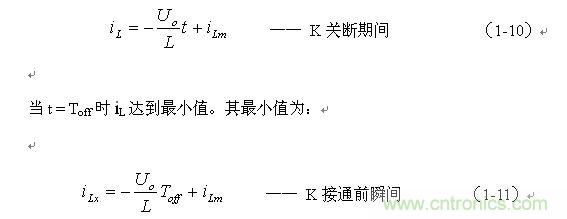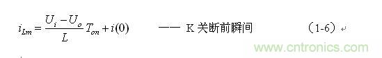 當(dāng)控制開關(guān)K由接通期間Ton突然轉(zhuǎn)換到關(guān)斷期間Toff的瞬間,流過電感L的電流iL達(dá)到最大值: