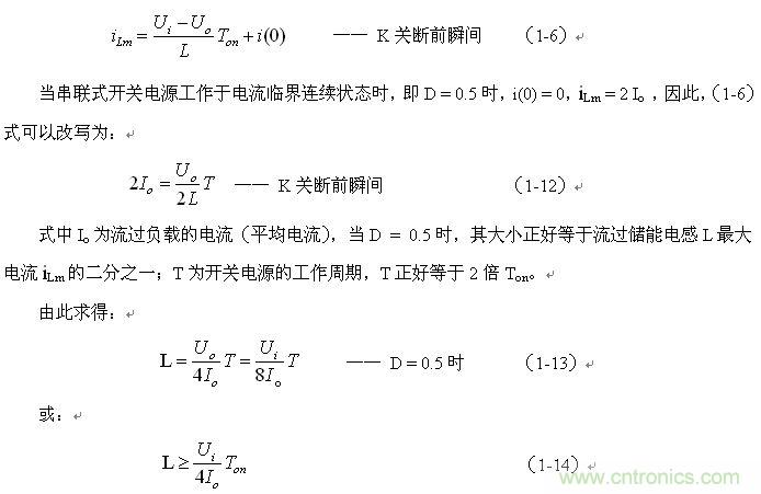 串聯(lián)式開關(guān)電源最好工作于電流臨界連續(xù)狀態(tài),或連續(xù)電流狀態(tài)。此時(shí),開關(guān)電源輸出電壓的調(diào)整率為最好,且輸出電壓Uo的紋波也不大。因此,我們可以從電流臨界連續(xù)狀態(tài)著手進(jìn)行分析。我們先看(1-6)式: