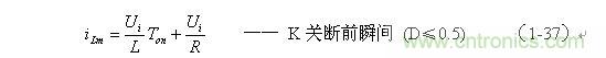 式中i(Ton+) 為控制開關(guān)K從Ton轉(zhuǎn)換到Toff的瞬間之前流過電感的電流,i(Ton+)也可以寫為i(Toff-),即:控制開關(guān)K關(guān)斷或接通瞬間,之前和之后流過電感L的電流相等。實(shí)際上(1-47)式中的i(Ton+) 就是(1-45)式中的iLm,因此,(1-47)式可以改寫為: