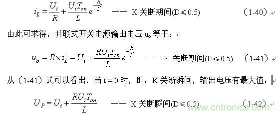式中的負(fù)號表示反電動勢eL的極性與(1-35)式中的符號相反,即: K關(guān)斷期間電感L產(chǎn)生電動勢的方向與K接通期間電感L產(chǎn)生電動勢的方向正好相反。