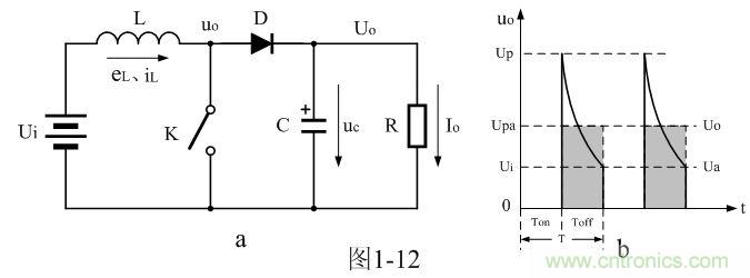 在圖1-12-a中,當(dāng)控制開關(guān)K接通時(shí),輸入電源Ui開始對儲能電感L加電,流過儲能電感L的電流iL開始增加,同時(shí)電流在儲能電感L中也要產(chǎn)生反電動勢eL;當(dāng)控制開關(guān)K由接通轉(zhuǎn)為關(guān)斷的時(shí)候,在儲能電感L兩端就會產(chǎn)生反電動勢eL。eL反電動勢的方向與開關(guān)K關(guān)斷前的方向相反,但與電流的方向相同,因此,在控制開關(guān)K兩端的輸出電壓uo等于輸入電壓Ui與反電動勢eL之和。
