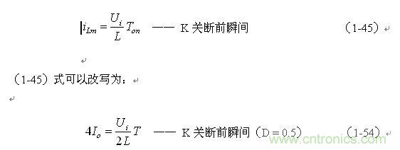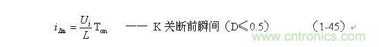 (1-44)式中iL為流過儲能電感L的電流(瞬時(shí)值),t為時(shí)間變量;i(0)為的初始電流,即:控制開關(guān)K接通前的瞬間流過儲能電感L中的電流。當(dāng)開關(guān)電源工作于電流臨界連續(xù)狀態(tài),或不連續(xù)電流狀態(tài)時(shí)(即D≤0.5),i(0) = 0 ,由此可以求得流過儲能電感L的最大電流為: