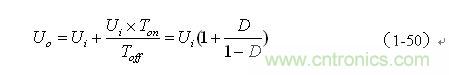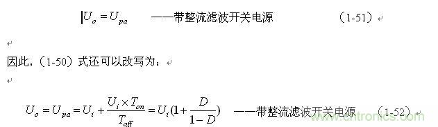 這里特別指出:(1-50)和(1-52)式的結(jié)果,雖然是以開關(guān)電源工作于電流臨界連續(xù)狀態(tài)的條件求得,但對于開關(guān)電源工作于連續(xù)電流狀態(tài)或斷流狀態(tài)同樣成立,因?yàn)?,輸出電壓Uo是取自輸出脈沖電壓uo的半波平均值Upa,而不是取其平均值Ua。