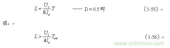 (1-55)和(1-56)式,就是計(jì)算并聯(lián)式開關(guān)電源儲能電感的公式。同理,(1-55)和(1-56)式的計(jì)算結(jié)果,只給出了計(jì)算并聯(lián)式開關(guān)電源儲能電感L的中間值,或平均值,對于極端情況可以在平均值的計(jì)算結(jié)果上再乘以一個(gè)大于1的系數(shù)。