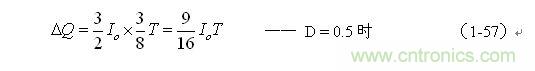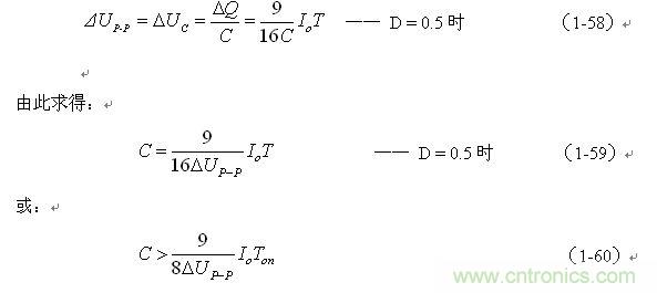 (1-59)和(1-60)式,就是計(jì)算并聯(lián)式開關(guān)電源儲能濾波電容的公式。式中:Io是流過負(fù)載電流的平均值,T為開關(guān)工作周期,ΔUP-P為濾波輸出電壓紋波,此紋波電壓ΔUP-P實(shí)際上就是電容器兩端的充放電電壓增量,即:ΔUP-P = ΔUc 。