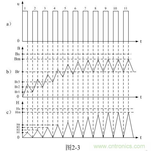 從圖2-3-a)和圖2-3-b)可以看出,每輸入一個(gè)直流脈沖電壓,變壓器鐵芯中的磁感應(yīng)強(qiáng)度B或磁通
