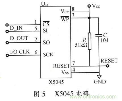 X5045電路的設(shè)計(jì)如圖5所示。本器件將四種功能合于一體:上電復(fù)位控制、看門(mén)狗定時(shí)器、降壓管理以及具有塊保護(hù)功能的串行EEPROM。它有助于簡(jiǎn)化應(yīng)用系統(tǒng)的設(shè)計(jì),減少印制板的占用面積,提高可靠性。將其與CPC以SPI總線(xiàn)方式連接,讀寫(xiě)簡(jiǎn)單,其內(nèi)部的EEPROM還可以保護(hù)一些重要數(shù)據(jù)。