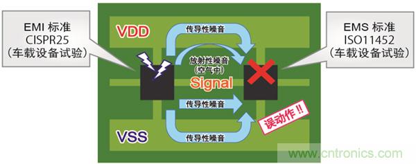 因此,對(duì)車載用產(chǎn)品來說,不妨礙其他設(shè)備(發(fā)射干擾)、以及受到其他設(shè)備妨礙時(shí)能保持本來的性能(抗干擾)是非常重要的。