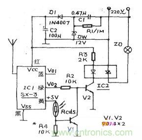 IC1是一只SX-3型人體接近開關集成電路模塊,該器件最大探測距離可達10米。其中紅線接正電源端,黑線接公共端,黃線為+5v電源輸出端,供外部使用,藍線為即時開關信號輸出端(本電路不用),綠線為具有時間累積功能的延時開關信號輸出端。220V市電由C1降壓、D1整流、C2濾波、DW穩(wěn)壓后為控制電路提供12V直流電源。平時,沒有人接近IC1或當行人很快從報欄前經(jīng)過時,IC1的VO2端輸出低電平,后級電路不動作,燈不亮。當有人要看報在報欄前停頓數(shù)秒后,IC1的V02端輸出高電平。白天時,光敏電阻Rcds為低阻值,V1導通,V2截止,后級電路仍不能工作。晚聞Rcds為高阻值,V1截止,的高電平使V2導通,光電耦合器IC2內(nèi)藏發(fā)光二極管發(fā)光,光敏可控硅開通,燈泡ZD發(fā)光。閱報者離開后,IC1V02端又變?yōu)榈碗娖剑琙D自動熄滅。