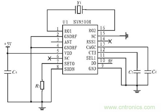 無線接收部分主要由解碼芯片SYN500R、晶振和外圍電路組成超外差接收模塊,接收模塊負責接收來自發(fā)送模塊的編碼,然后將編碼交由處理器處理,處理器處理后通過放大器將信號放大,然后控制繼電器的開和合,接收部分電路圖如圖4所示。